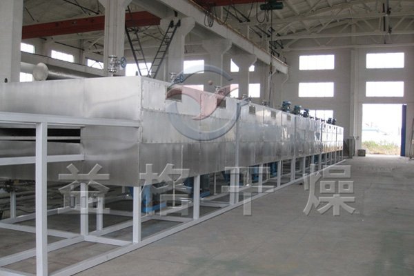 物料由加料器均匀地铺在网带上,网带一般采用12-60目不锈钢丝网,由传动装置拖动在干燥机内移动。干燥机由若干单元组成,每一单元热风独立循环,部分尾气由专门排湿风机排出,废气由调节阀控制,热气由下往上或由上往下穿过铺满物料的网带完成热量与质量传递的进程,带走物料水份。网带缓慢移动,运行速度可根据物料温度自由调节,干燥后的成品连续落入收料器中。上下循环单元根据用户需要可灵活配备,单元数量亦可根据需要选取。